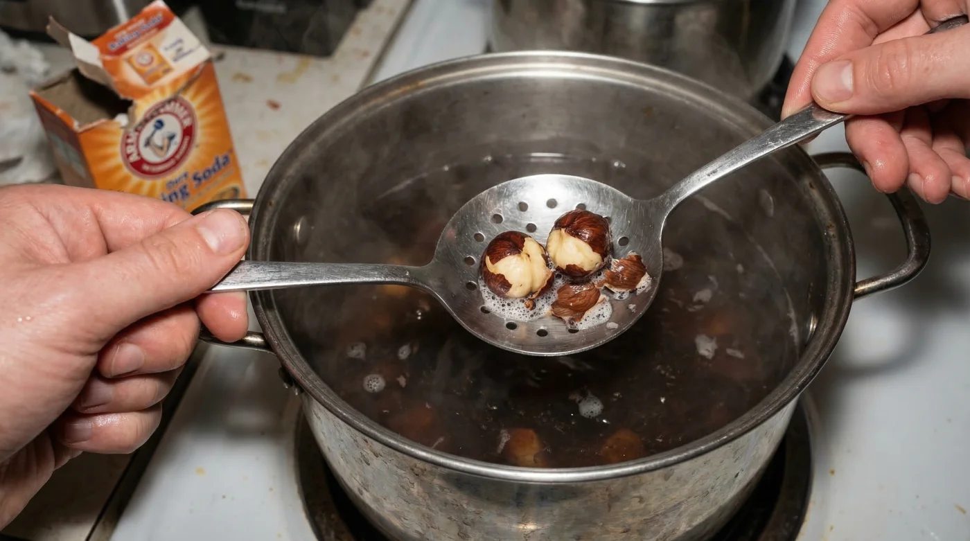 Das Geheimnis dieses Tricks liegt in der Lebensmittelchemie, genauer gesagt im Einsatz von Natriumhydrogencarbonat, im Alltag als Natron bekannt. Die braune Haut der Haselnuss wird durch komplexe Pektinverbindungen fest an den weißen Kern gebunden. Diese Haut ist zudem reich an Tanninen (Gerbstoffen) und Zellulose, was sie extrem widerstandsfähig gegen reines Wasser macht. Wenn Sie jedoch Natron in kochendes Wasser geben, erhöhen Sie den pH-Wert der Lösung drastisch und schaffen ein alkalisches Milieu. Dieses alkalische Bad greift die Pektinbindungen gezielt an und zersetzt sie innerhalb von Minuten. Experten raten dazu, exakte Dosierungen einzuhalten, um diesen chemischen Prozess optimal zu nutzen, ohne den Kern zu schädigen.